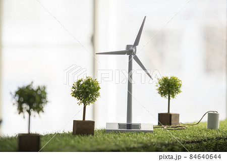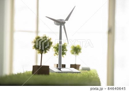 Studio Shot of small wind turbine, mobile phone and note pad on desk