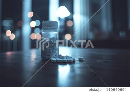 テーブルの上に置かれたたくさんの錠剤の入ったボトル AI画像