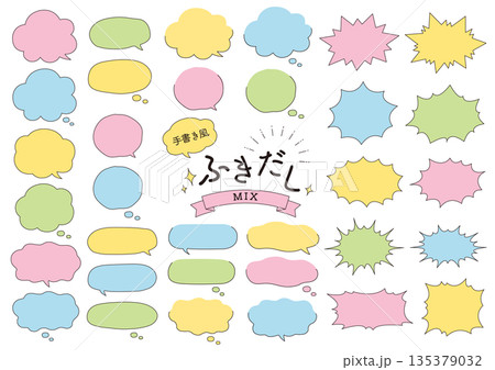 パステルカラーの手書き風の色々な形の吹き出しのセット_主線