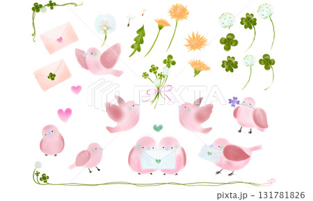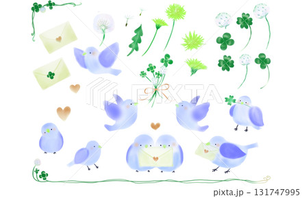 カラフルな小鳥と植物のイラスト素材セット (水彩風ベクター)