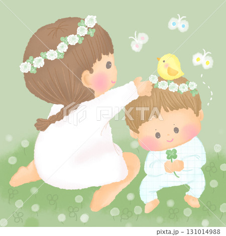 春_シロツメクサの花冠を被る女の子と赤ちゃん