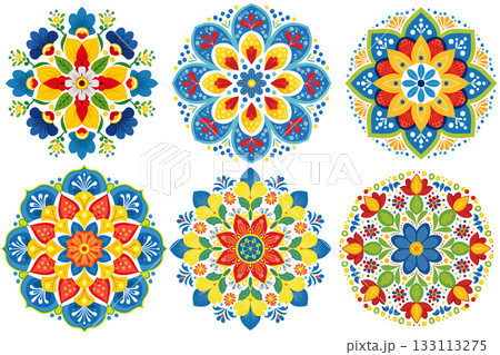 カラフルな民芸風フラワー曼荼羅セット|インテリア・プリント・ファブリックデザイン向け