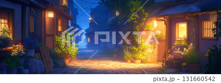 夜の田舎の住宅街、アニメ風