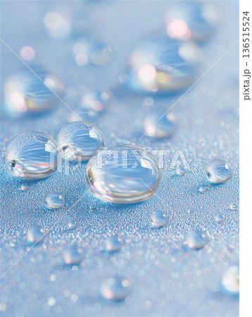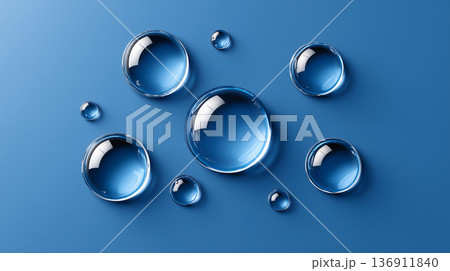 鮮やかなブルーの背景に浮かぶ透明な水滴のクローズアップ構図、清潔感とみずみずしさを演出