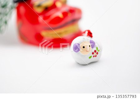 白い背景に置かれた紅白の午の置物と和柄のお年玉袋 お正月のイメージ