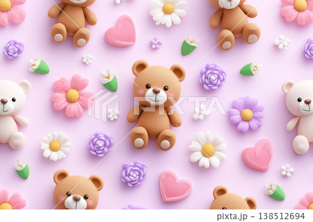 水玉模様のリボンをつけたテディベアが並んでいるイラスト