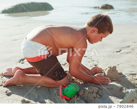 A boy standing beside a sandcastle, on top of a mound of sand. Beach.
