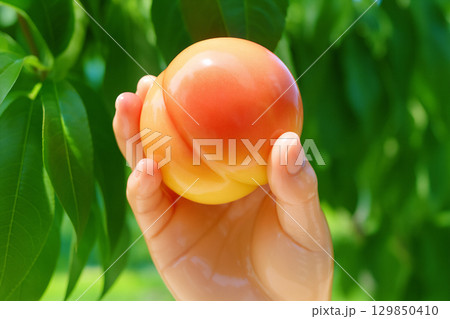 AI-generated content. Close-Up of a Hand Gently Picking a Ripe Peach From a Tree on a Sunny Day