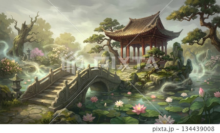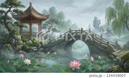 Ancient Chinese Garden with Arched Bridge, Pavilion, and Lotus Pond