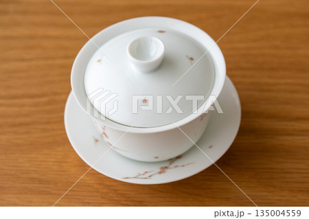 俯瞰した台湾茶、中国茶用の蓋椀 (梅の絵柄)