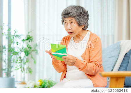 ブタの貯金箱に座って紙を見るシニア女性のイラスト
