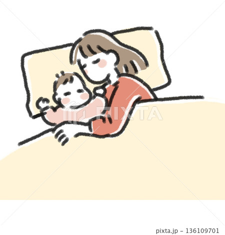 添い寝をして一緒に眠る母親と赤ちゃんのイラスト シンプル 手描き 育児・睡眠・休息の挿絵