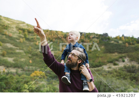 遠くを眺める親子