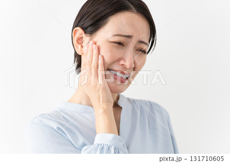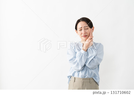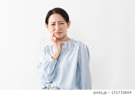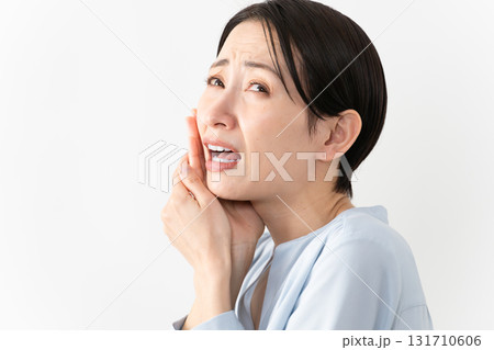 歯が痛い中年女性 白背景