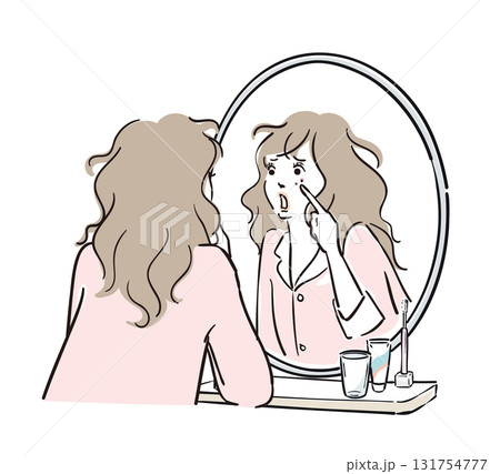 鏡を見る女性ーニキビやシミなど肌のトラブルに悩む女性のイラスト素材
