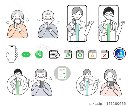オンライン診療 スマホ相談中の患者と医師 イラストアイコンセット