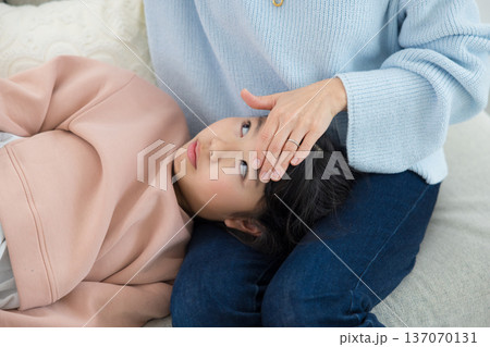 膝の上に寝かせた娘の額に手を当てて熱を計る母親