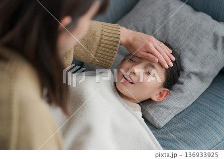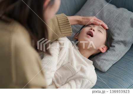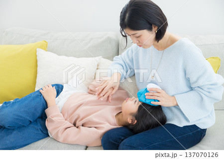 体調の悪い女の子と看病する母親
