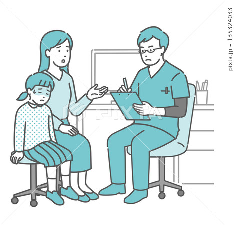 体調不良の女の子と母親の問診(男性医師・白衣・小児科)