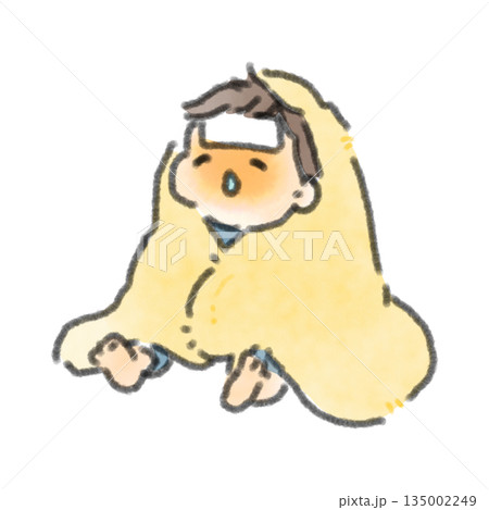 風邪をひいて熱が出て冷えピタを貼り毛布に包まる赤ちゃんの看病シーンを描いた水彩風手描きイラスト