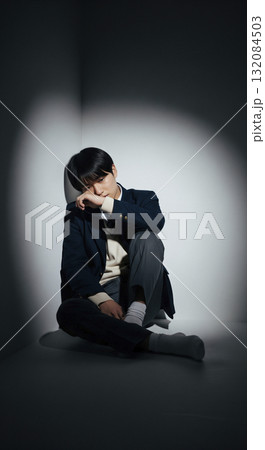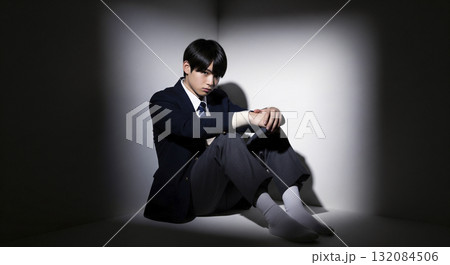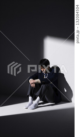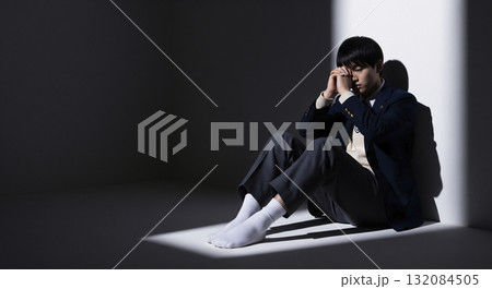 部屋の隅っこで座り込んで落ち込む男子高生