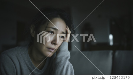 暗い部屋で1人で悩む日本人女性