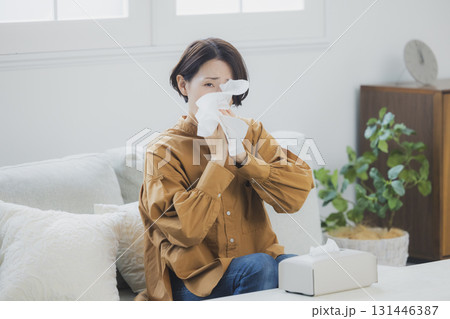 冬の部屋で鼻をかむミドル〜シニア女性