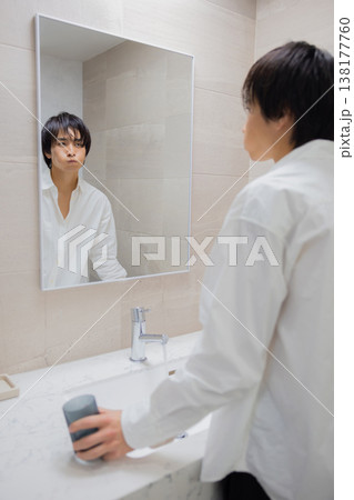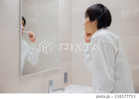 洗面所で歯磨きをする男性
