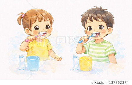 歯磨きをする子どもたちの衛生習慣と健康イメージイラスト