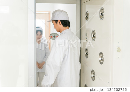 エアーシャワー・クリーンルームのある工場で働く作業員(点呼・確認)