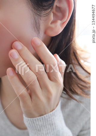 美顔器でマッサージしながらお肌に悩む若いアジア人女性(スキンケア)