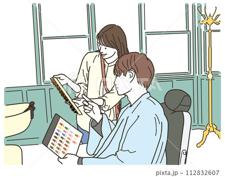 ヘアサロンでヘアカラーを選ぶ女性と美容師