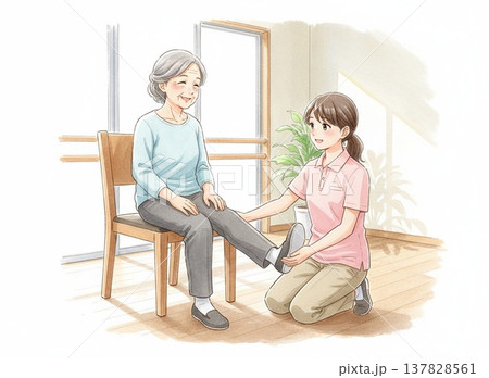 椅子に座って足の運動をする高齢者と理学療法士の指導 水彩画風イラスト