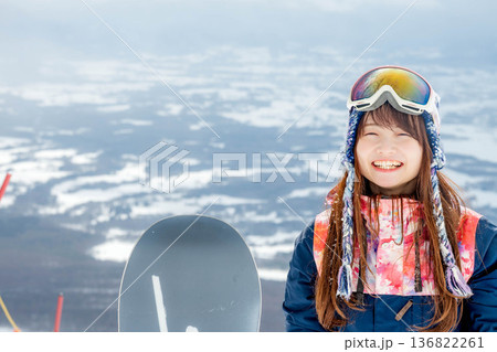 ゲレンデの頂上でスノーボードを楽しむ若い女性