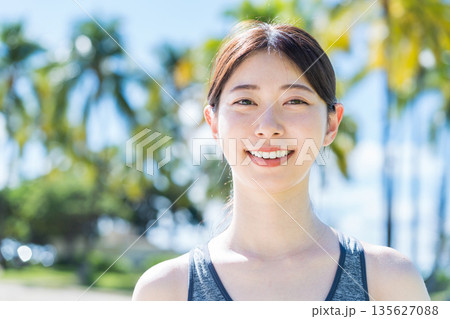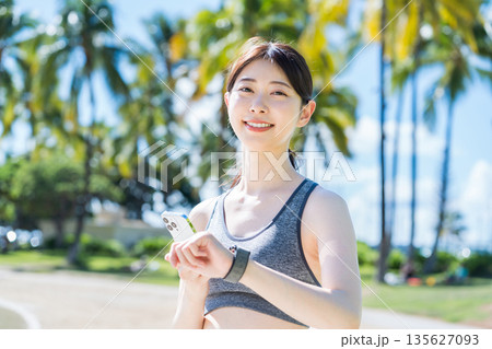 リゾート地でジョギングをする若い女性
