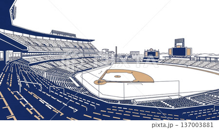 野球場スタジアムと都市スカイラインのイラスト 線画 ベイエリア 野球場 パノラマ景観 背景素材