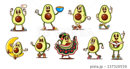 Cartoon groovy avocado characters in fun actions and costumes. Vector set of retro comic personages with nachos and salsa, dancing, reading, relaxing on the moon, wearing traditional Mexican dress