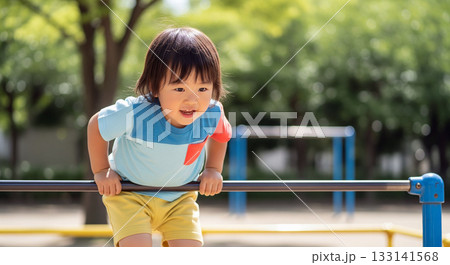 公園の鉄棒の上に座る女の子