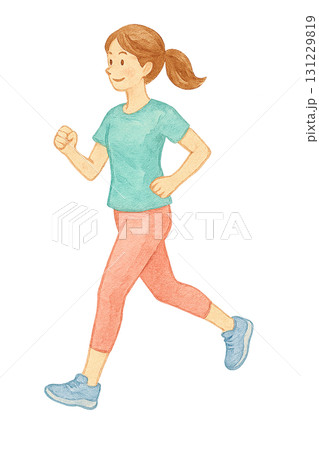 トレッドミルで走る女性の水彩イラスト(スポーツ・運動素材)
