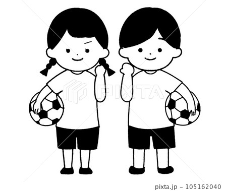 サッカーボールを持つ子供 ファイトポーズ(白黒)