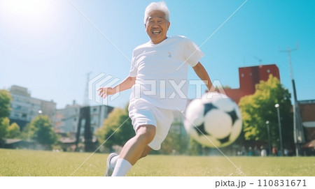 運動場でサッカーボールを持つサッカーファン・サポーターの日本人女性