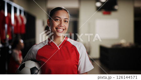 Locker room, woman and portrait with football for sports, match competition and athlete with smile. Changing area, player and female person with happiness for soccer, game and confident for playing