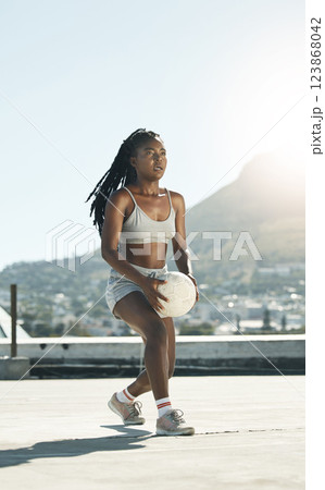 City, girl and soccer on rooftop for sports fitness training with concentration in South Africa. Exercise, football and black woman holding ball for cardio practice with mountain cityscape.