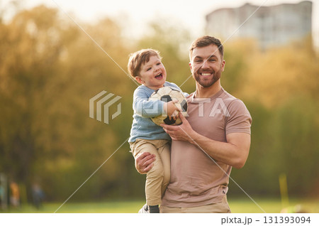 Standing, holding soccer ball. Happy father with son are having fun on the field at summertime