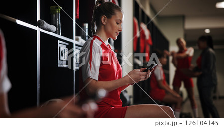 Cellphone, woman and athlete in locker room for game, match or practice with scrolling on social media. Tech, relax and female soccer player with phone for networking on mobile app in changing area.