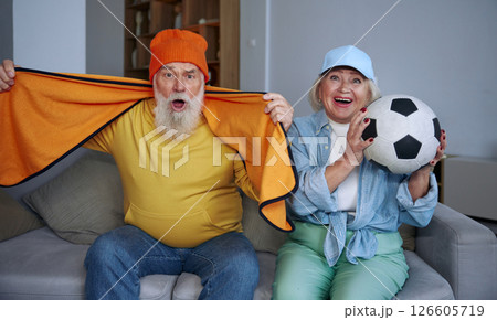 Portrait shot of overjoyed elderly couple watching football match on tv
