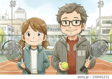 テニスを楽しむ親子|ラケットを持つ父親と女の子のスポーツイメージ