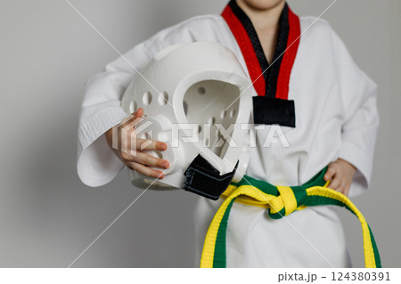 A child in a taekwondo uniform holds in his hands a white protective helmet for his head, ready for classes. Yellow-green belt