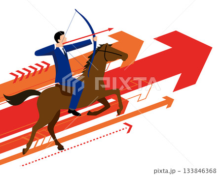 新年のイラスト。馬に乗って弓矢を構えるビジネスマンのフラットイラスト、赤い矢印、ベクター素材