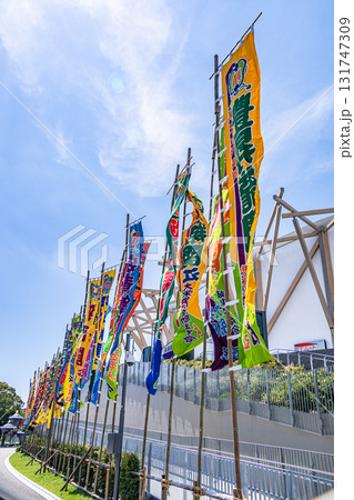 開催中の大相撲のぼり旗が立ち並ぶ風景